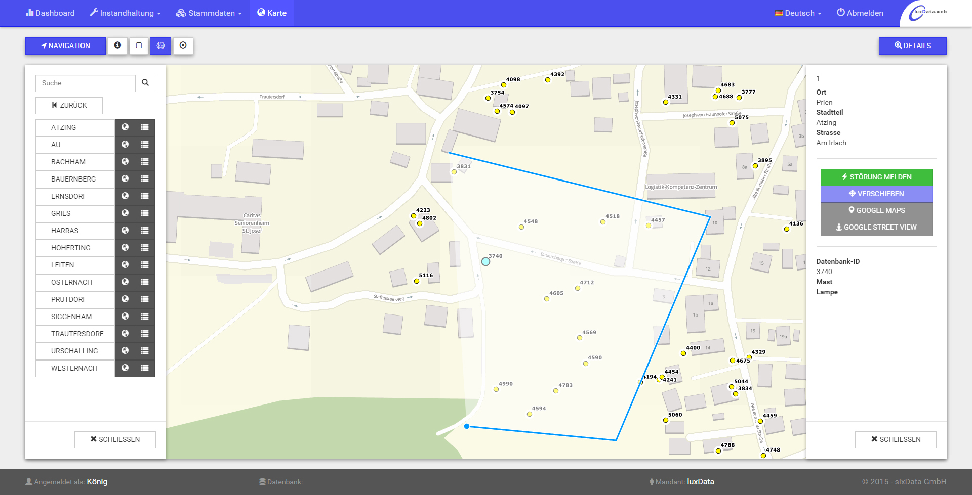 luxData.web provides an integrated geo-information system that is able to display the lighting points on any map material. It is possible to incorporate any additional source of GIS data (OGC WMS, WFS, Oracle, PostGIS, Shapefiles etc.) alongside the already pre-configured basic and free OpenStreetMap, which would, for example, show additional layers for cable gears, ALK, aerial images and so on. The map view also allows users to click lighting points so that defects may, for example, be reported or the area around the lighting point viewed with the help of Google StreetView (as it becomes available in Germany): the GIS viewer in luxData.web doesn't require any browser plug-ins (e.g. ActiveX or Java and so on) and will work with all modern browsers.
